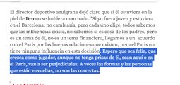 antes de hablar con el PSG el barca me pidio disculpas, esta por demas….las disculpas dse ganan con acciones, no con palabras. y a mi lo que me demostro el club durante mi trayectoria es pura traicion, falsas promesas, falta de accion, y una actitud completemante incorrecta. Hay un monton de jugadores que decidieron ponerse patines y patinar solitos, pero esos son como los piratas, o las ratas, que son las primeras en abandonar los barcos cuando se hunden."El jugador menciona estar decepcionado con el club. "Pensaba mas de ellos." dice. "De hecho, pensaba mejor de ellos, pero en fin, asi esta la cosa." "Asi es e futbol." "Hay demasiados equipos en la liga, y demasiados jugadores."