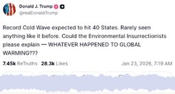 >>24161891, >>24171624 “Whatever Happened To Global Warming???” – Trump Mocks ‘Environmental Insurrectionists’ as Record Freeze is Predicted in 40 States