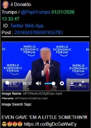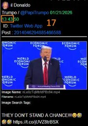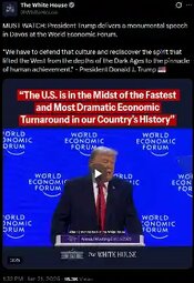 >>24153997 At Davos, Switzerland, the US president rebuked ‘green energy’ ideology and declared America avoided Europe’s ‘catastrophic energy collapse’ by rejecting the Green New Deal.