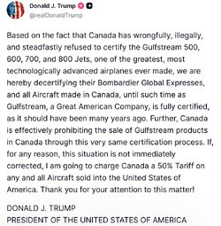 >>24191996 @realDonaldTrump Based on the fact that Canada has wrongfully, illegally, and steadfastly refused to certify the Gulfstream 500, 600, 700, and 800 Jets, one of the greatest, most technologically advanced airplanes ever made, we are hereby decertifying their Bombardier Global Expresses, and all Aircraft made in Canada, until such time as Gulfstream, a Great American Company, is fully certified.