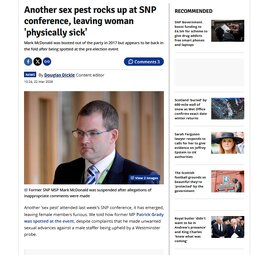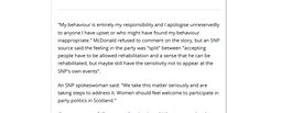 "My behaviour is entirely my responsibility and I apologise unreservedly to anyone I have upset or who might have found my behaviour inappropriate." McDonald refused to comment on the story, but an SNP source said the feeling in the party was "split" between "accepting people have to be allowed rehabilitation and a sense that he can be rehabilitated, but maybe still have the sensitivity not to appear at the SNP's own events".
