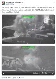 >>24361045 Footage shows a vessel with the Iranian Naval Forces, believed to likely be a Shahid Soleimani-class missile corvette operated by the Islamic Revolutionary Guard Corps Navy (IRGCN), explode today off the coast of Bandar Lengeh in the Persian Gulf, following a strike by the United States.