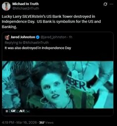 Lucky Larry SILVERstein’s US Bank Tower destroyed in Independence Day. US Bank is symbolism for the US and Banking.