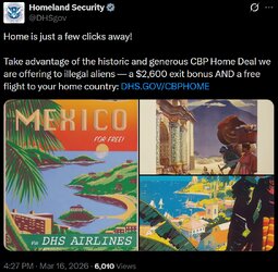 >>24389054 @DHSgov - CBP Home Deal we are offering to illegal aliens — a $2,600 exit bonus AND a free flight to your home country: