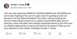 >>24387585, >>24387618 Donald Trump warns Nato faces ‘very bad future’ if allies fail to help US in Iran