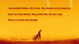 "The visions are clear now. I see possible futures, all at once. Our enemies are all around us, and in so many futures they prevail. But I do see a way, there is a narrow way through."