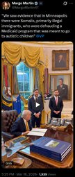 >>24388860 President Trump: When you look at the Minnesota scam, a lot of it has to do with Somalia. Nobody's calling out anybody, but a lot of it has to do with Somalia, and plenty of others. And I believe the governor [Walz] is complicit. I believe Ilhan Omar is complicit. I believe that your attorney general [Ellison] is complicit. And if they are, you're going to hopefully find out about it [Vice President Vance], and you're gonna do what you have to do.