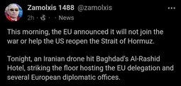 >>24390414 A drone attack targeted the Al-Rasheed Hotel in Baghdad's Green Zone, which has long served as a residence for European diplomats and is located near the Iraqi Foreign Ministry and several European embassies.