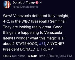 >>24390520 PDJT: Wow! Venezuela defeated Italy tonight, 4-2, in the WBC (Baseball!) Semifinal. They are looking really great.