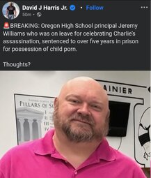 >>24395933 Oregon high school principal Jeremy Williams who was placed on leave for celebrating the assass*nation of Charlie Kirk has just been SENTENCED to 5 YEARS in prison over possession of child p*rnography