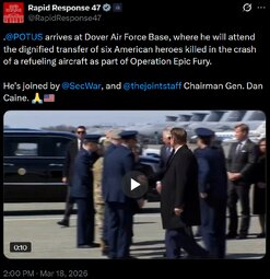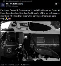 >>24396828 @POTUS departs for Dover Air Force Base, where he'll attend the dignified transfer of six American heroes killed in the crash of a refueling aircraft as part of Operation Epic Fury. 🙏🇺🇸