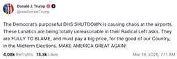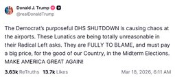 Across the country, the reckless Democrat DHS shutdown is causing longer airport lines, missed paychecks, empty fridges, and worsening travel chaos EVERY DAY.