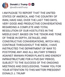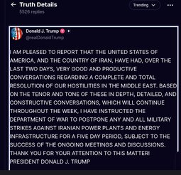 >>24416284, >>24416590, >>24416593, >>24416598 Trump HALTS strikes against Iran energy targets after 'very good' talks