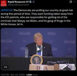 >>24416454 @realDonaldTrump I am a BIG proponent of ICE wearing masks as they search for, and are forced to deal with, hardened criminals, many of whom were let into our Country by Sleepy Joe Biden and his wonderful “Border Czar,” Kamala