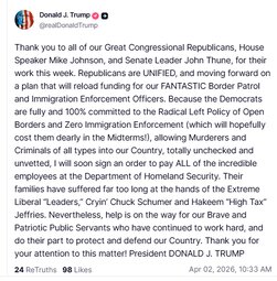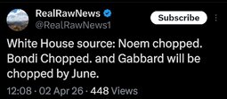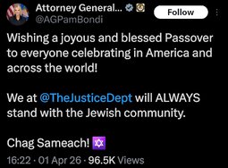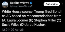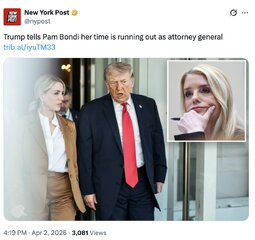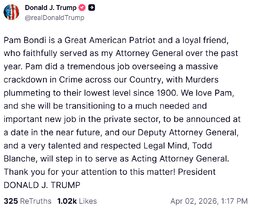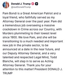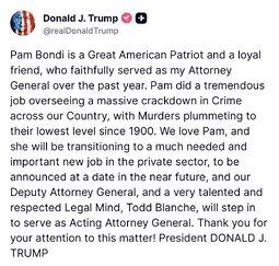 >>24456364, >>24456499, >>24456507 @realDonaldTrump Pam Bondi is a Great American Patriot and a loyal friend, who faithfully served as my Attorney General over the past year. Pam did a tremendous job… We love Pam, and she will be transitioning to a much needed and important new job in the private sector, to be announced at a date in the near future… Todd Blanche, will step in to serve as Acting Attorney General.