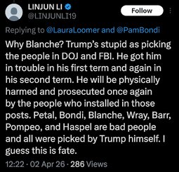 well, just heard trump was upset bondi not prosecuting enough, thus the change to blanche.