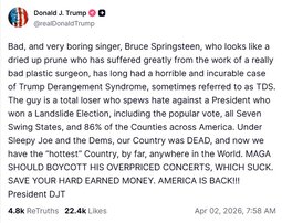 >>24455209 @realDonaldTrump Bad, and very boring singer, Bruce Springsteen, who looks like a dried up prune who has suffered greatly from the work of a really bad plastic surgeon… BOYCOTT HIS OVERPRICED CONCERTS, WHICH SUCK.