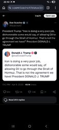 >>24483286 @realDonaldTrump Iran is doing a very poor job, dishonorable some would say, of allowing Oil to go through the Strait of Hormuz. That is not the agreement we have!
