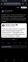 >>24483010 @realDonaldTrump There are reports that Iran is charging fees to tankers going through the Hormuz Strait — They better not be and, if they are, they better stop now!
