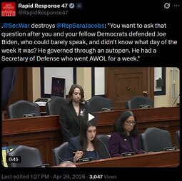>>24553774 @SecWar on Iran: "The biggest adversary we face at this point are the reckless, feckless, and defeatist words of congressional Democrats and some Republicans… two months in on an existential fight for the safety of the American people. Iran cannot have a nuclear bomb. We are proud of this undertaking."