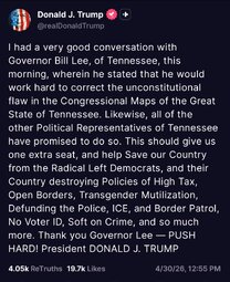>>24558260, >>24558329 @realDonaldTrump Governor Bill Lee, of Tennessee, this morning… stated that he would work hard to correct the unconstitutional flaw in the Congressional Maps of the Great State of Tennessee.